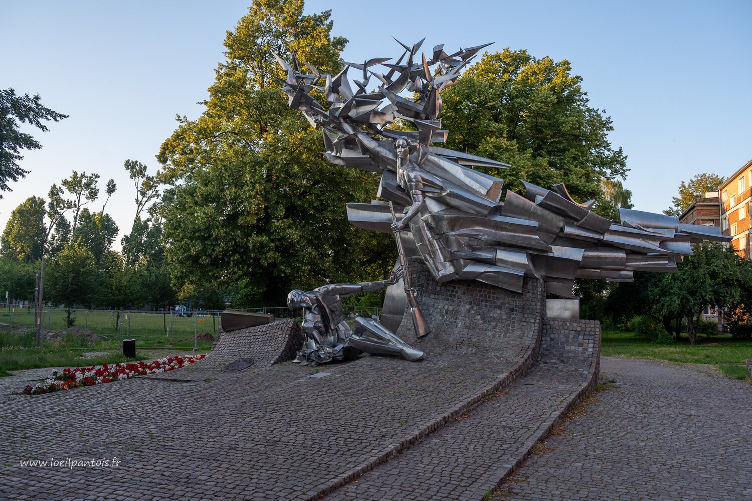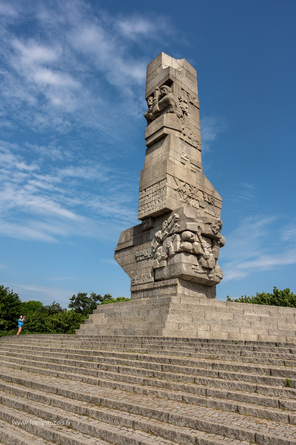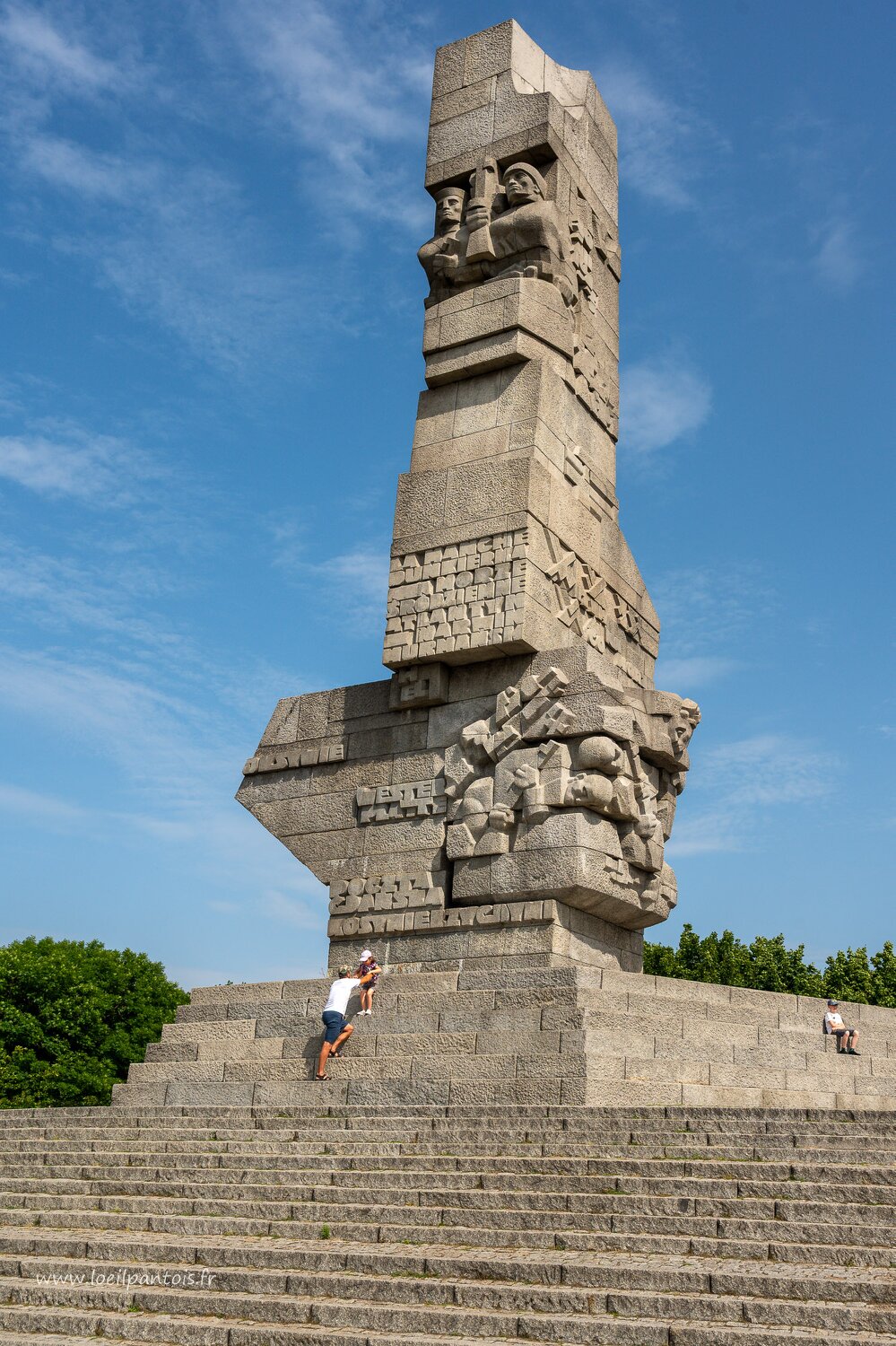 Monument aux défenseurs de la poste (1966 Wincenty Kućma) montrant un facteur mourant, au sol, à qui la déesse Niké (déesse de la victoire) tend un fusil.