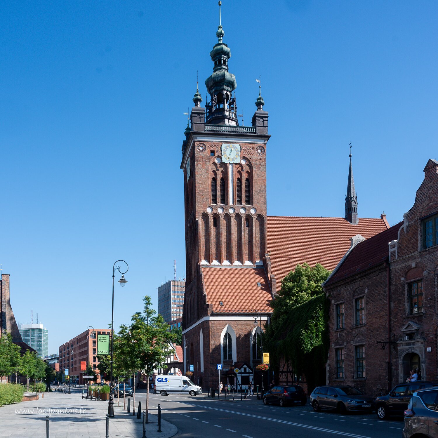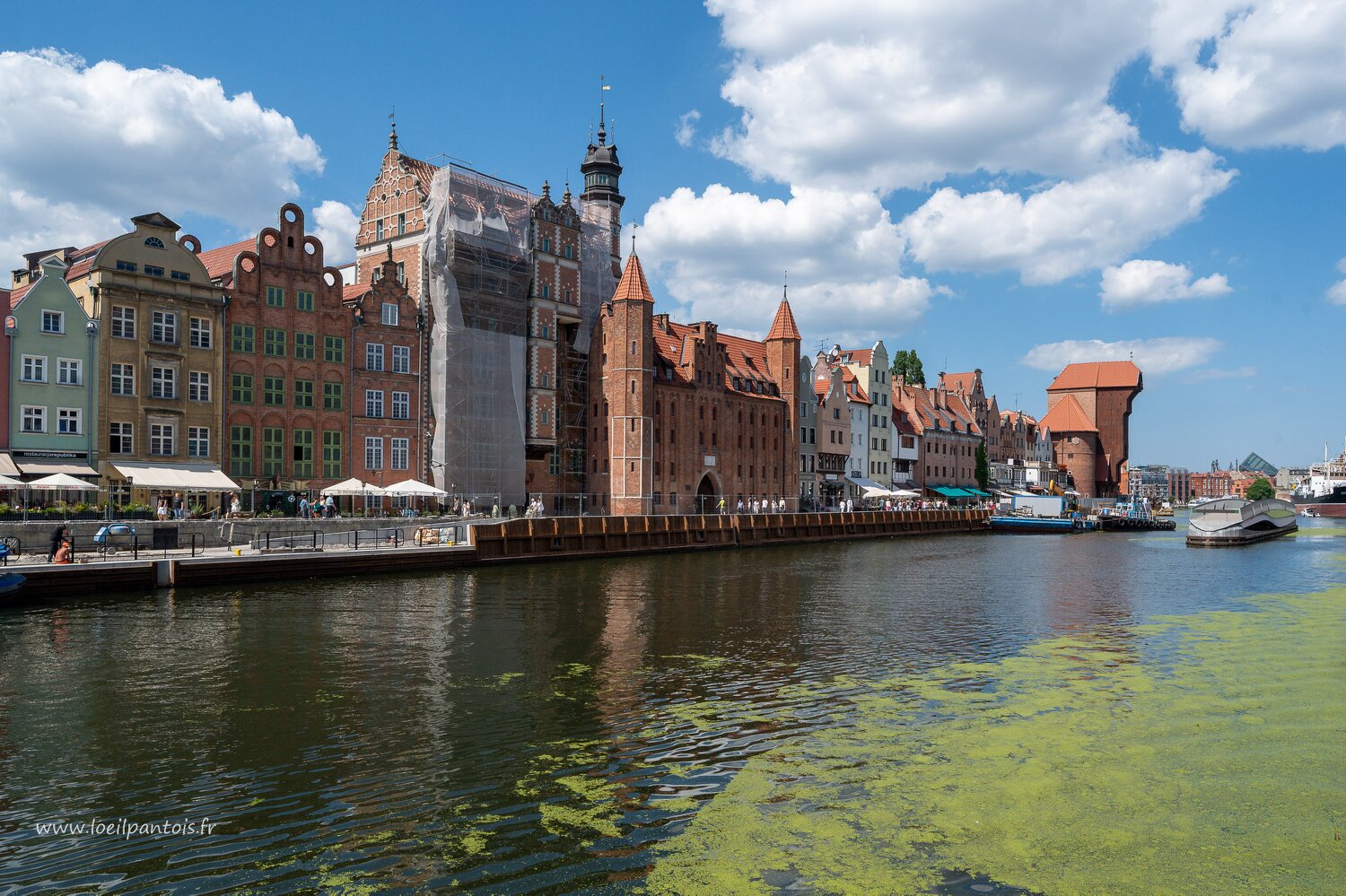 Vue sur le long quai (Długie Pobrzeże) le long de la Motlawa, vue sur le musée archéologique avec sa grande tour, la porte St Marie et plus loin la grue…
