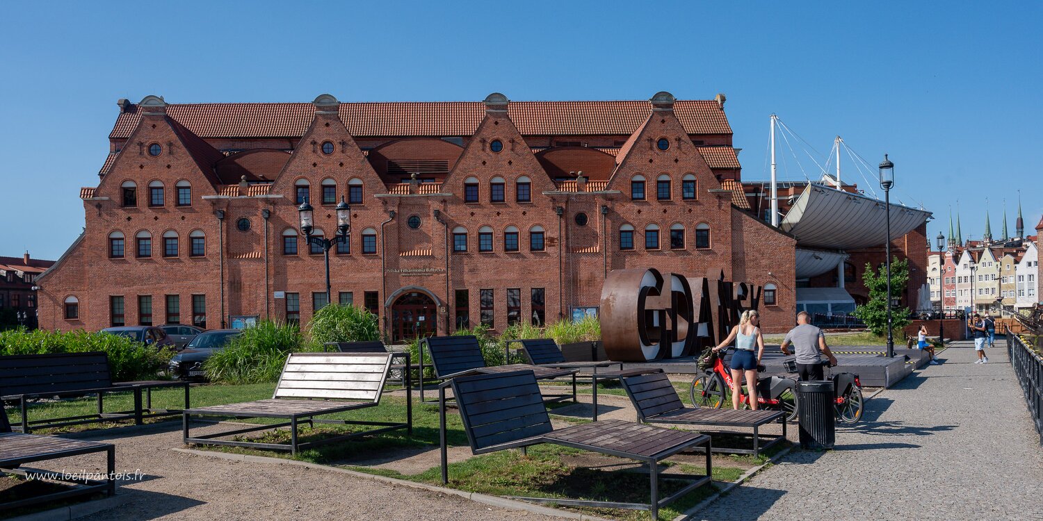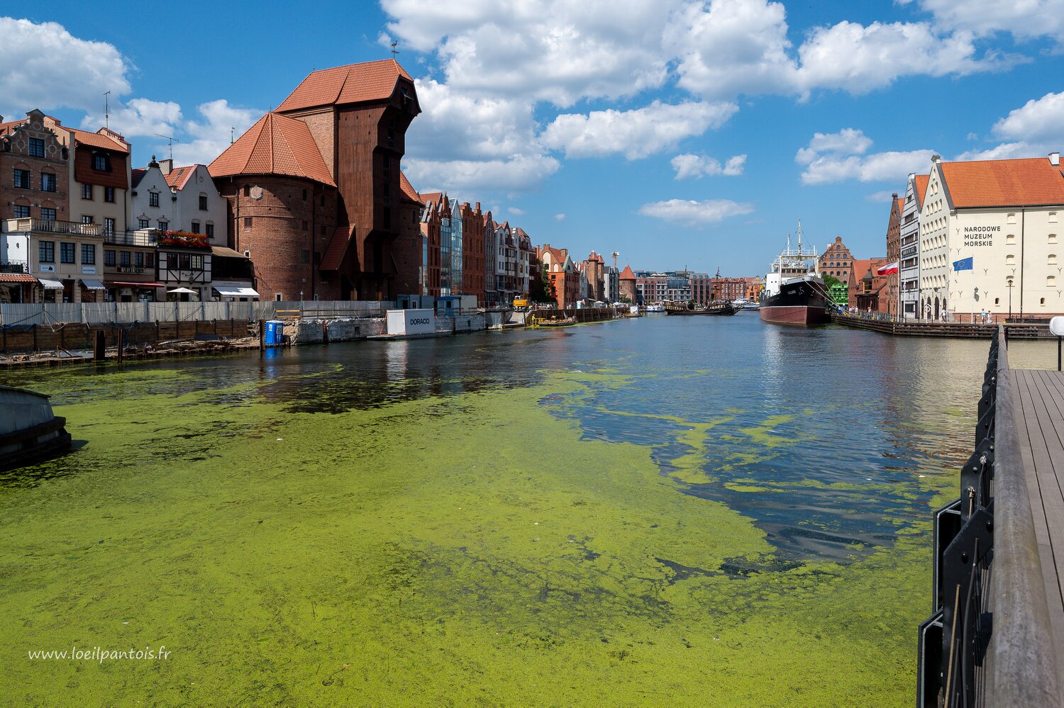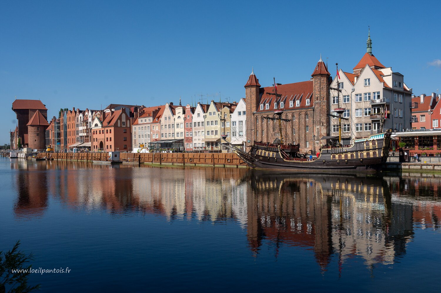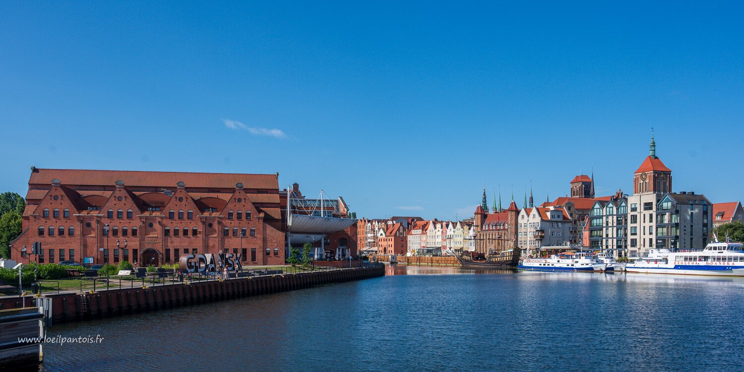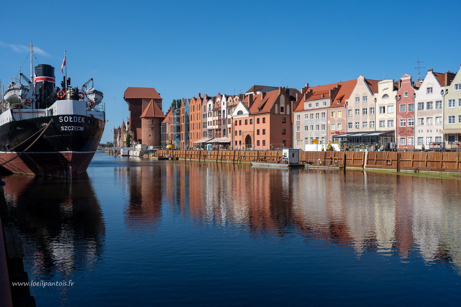 Vue sur le long quai (Długie Pobrzeże) le long de la Motlawa, vue la grue médiévale et, à droite sur le musée maritime national et le vaisseau musée soldek.