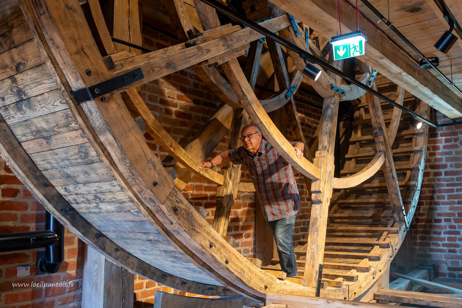 Grue médiévale de Gdansk, deux tympans assurent le mouvement, soit lever à 27m une charge de 2t avec un seul tympan, soit une charge de 4t à 11m avec les deux…