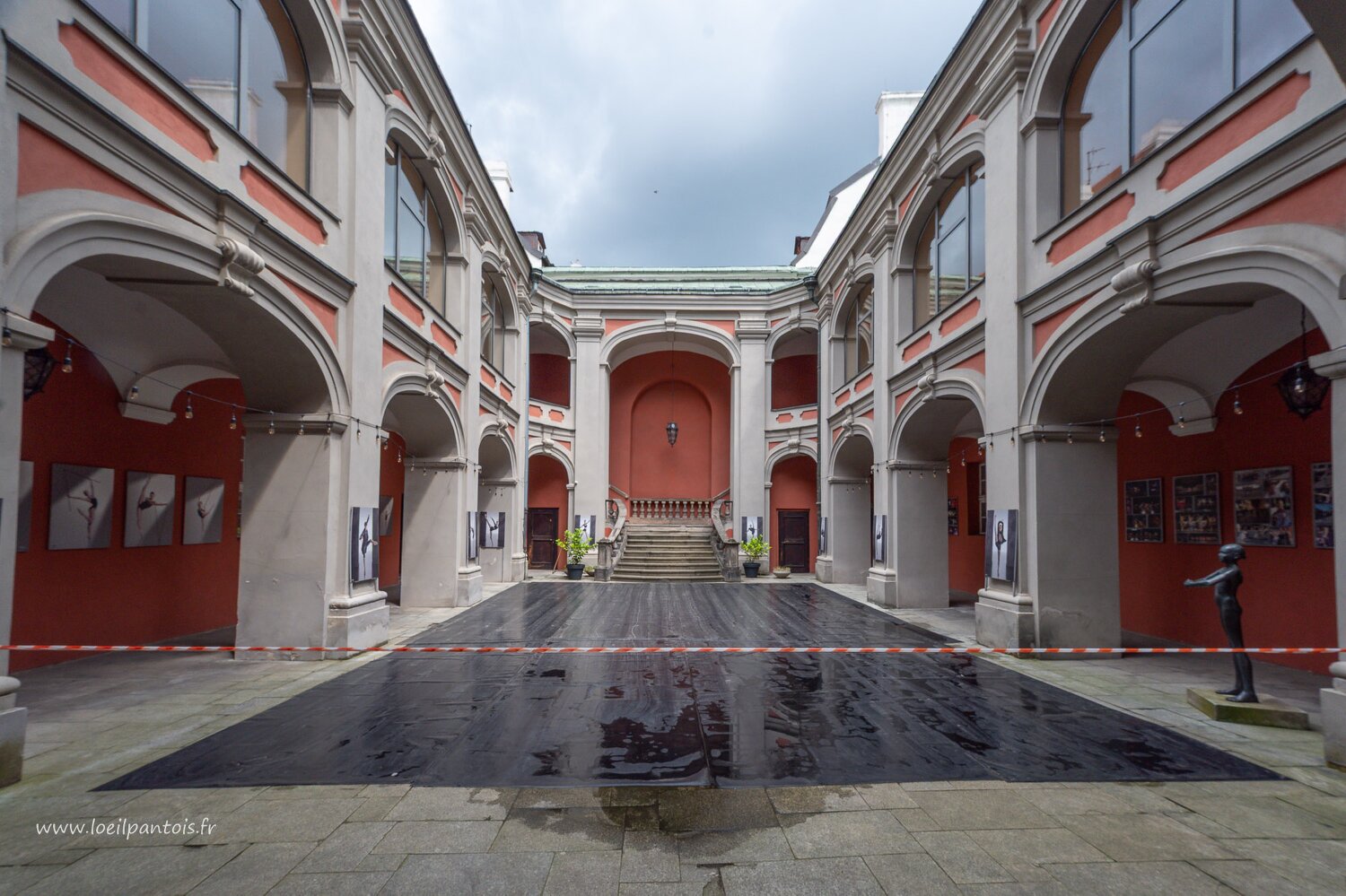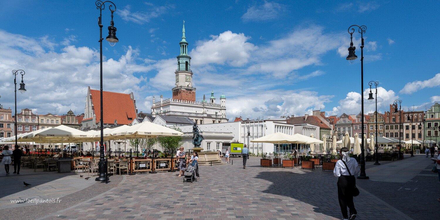 Place du vieux marché, côté ouest avec, à gauche, surmonté d'un aigle, le palais Dzialynski du XVIIIe s pour un grand maréchal de Lituanie, et à droite la…