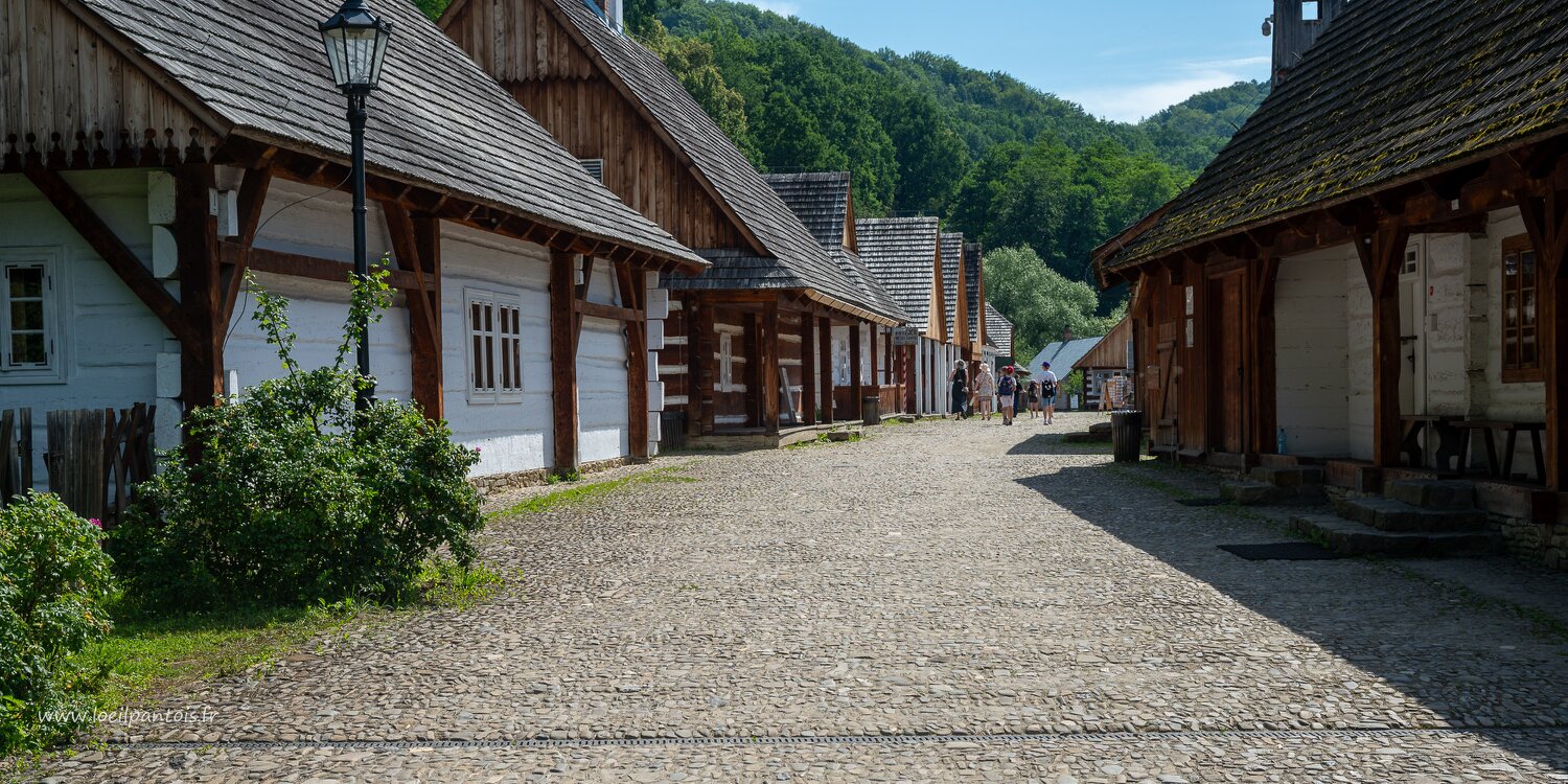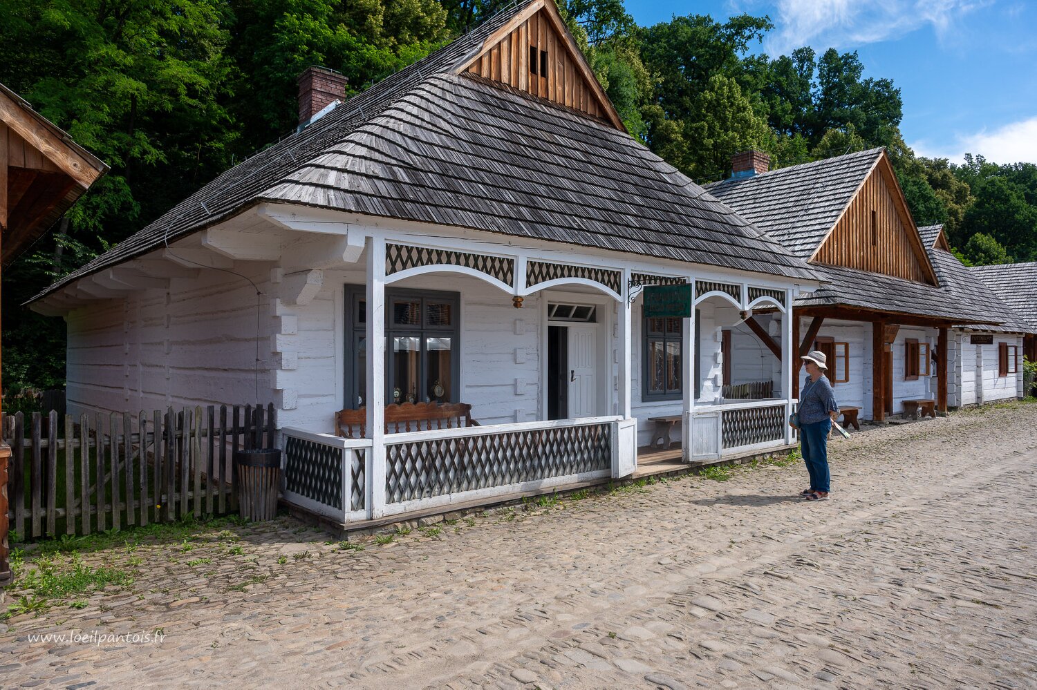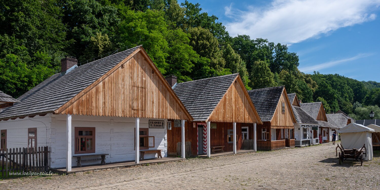 Musée d'architecture populaire de Sanok, A gauche, maison du tailleur, bureau de tabac et maison de professeur (2e moitié XIXe s)