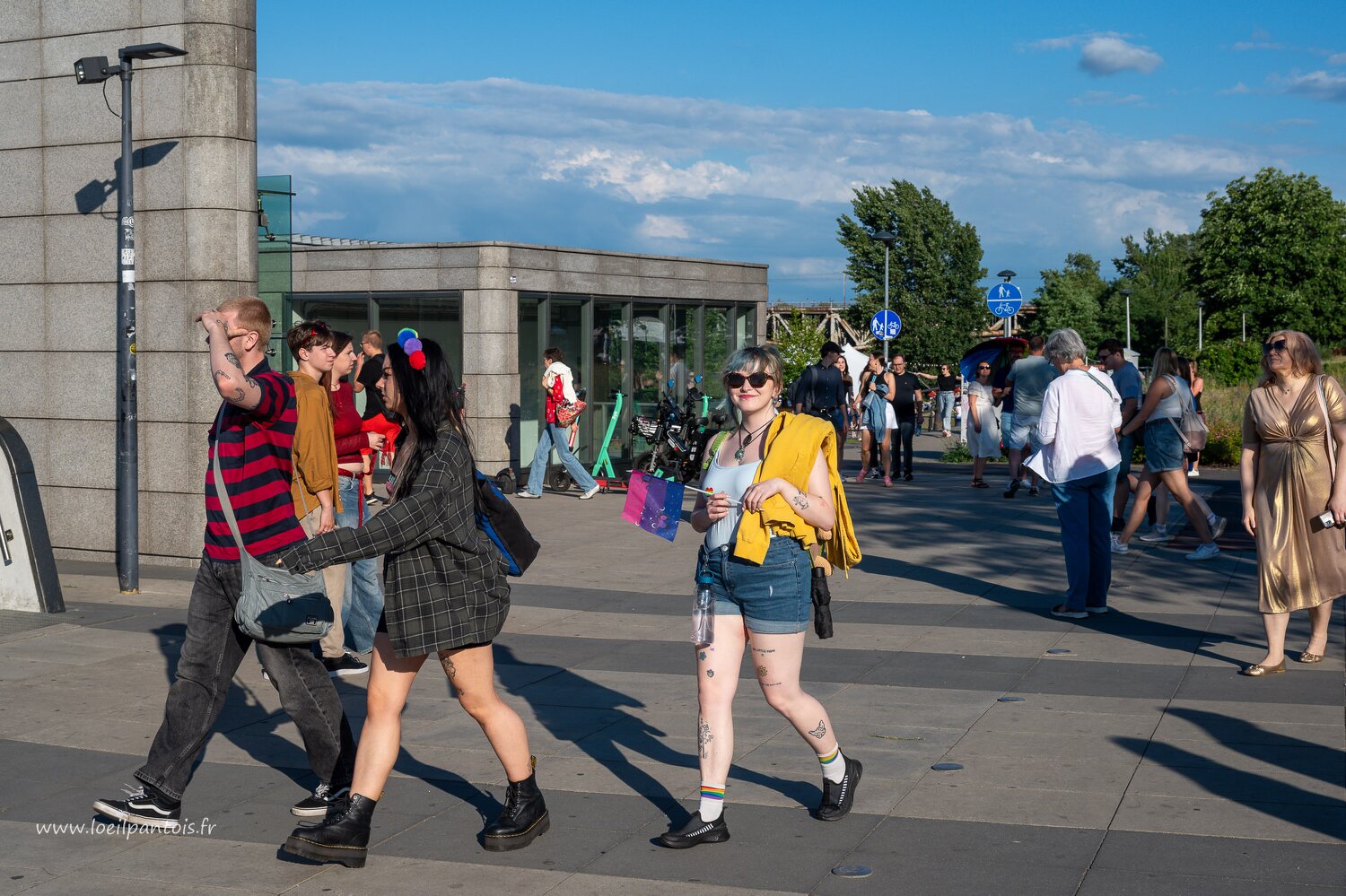 Gay pride, sur le pont de la Ste Croix, manifestation fortement sonorisée de la fondation Vie et Famille, avec une affiche supposée démontrer la monstruosité…