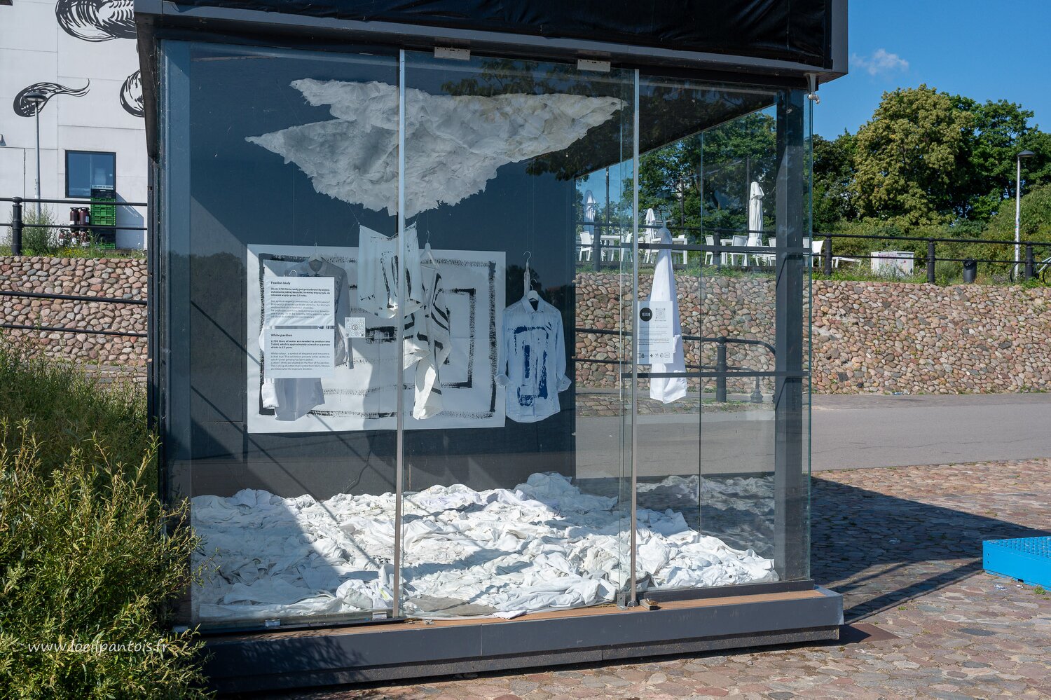 Quai de la Vistule, devant le musée d'art moderne, Le pavillon blanc mettant en contraste l'annonce du blanc et la consommation de 2700l d'eau par T shirt.
