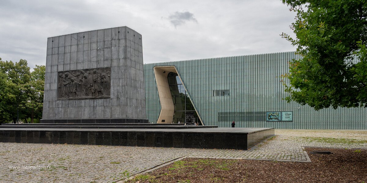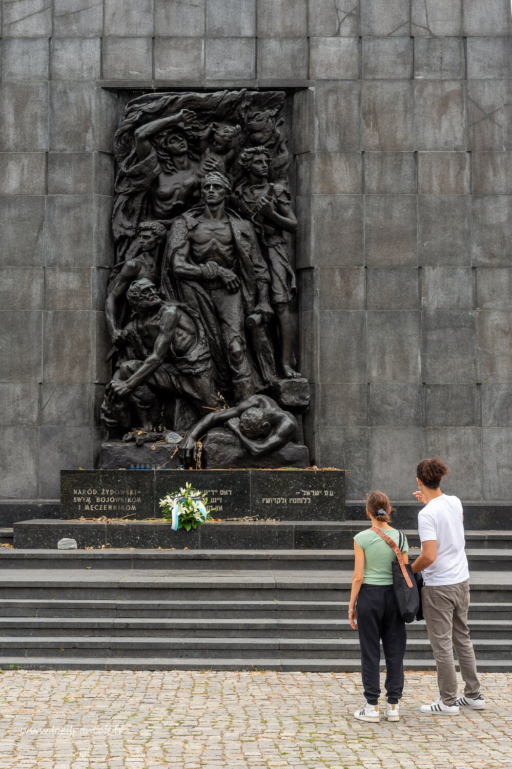 Devant le musée de l'histoire des juifs polonais, Monument aux héros du ghetto (architecte Leon Suzin, sculpteur Nathan Rapoport) face est, bas relief en pierre…