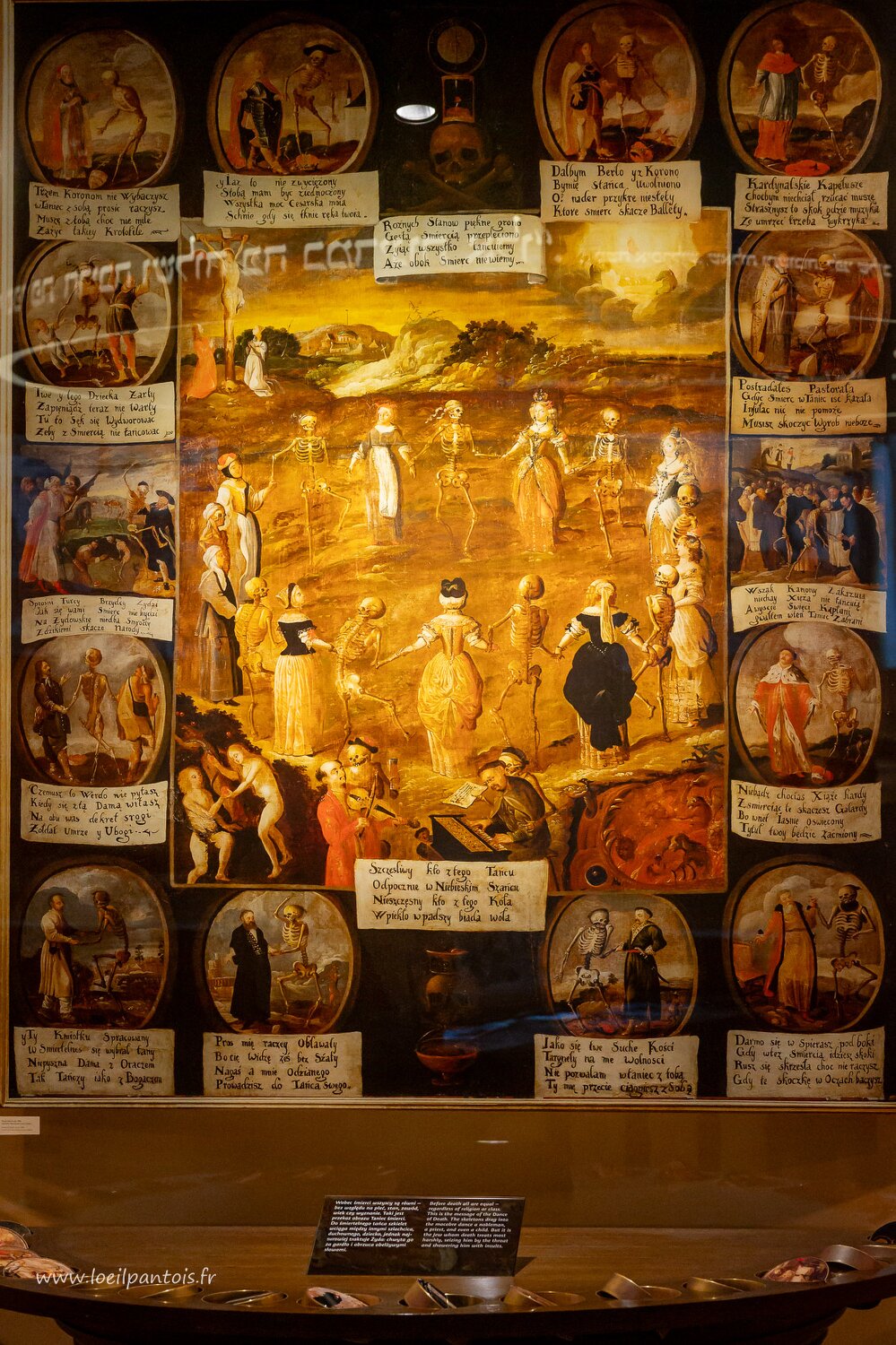 Musée de l'histoire des juifs polonais, 'Danse de la mort' vers 1680.Les cartouches autour de la danse principale montrent que la mort traite avec respect…