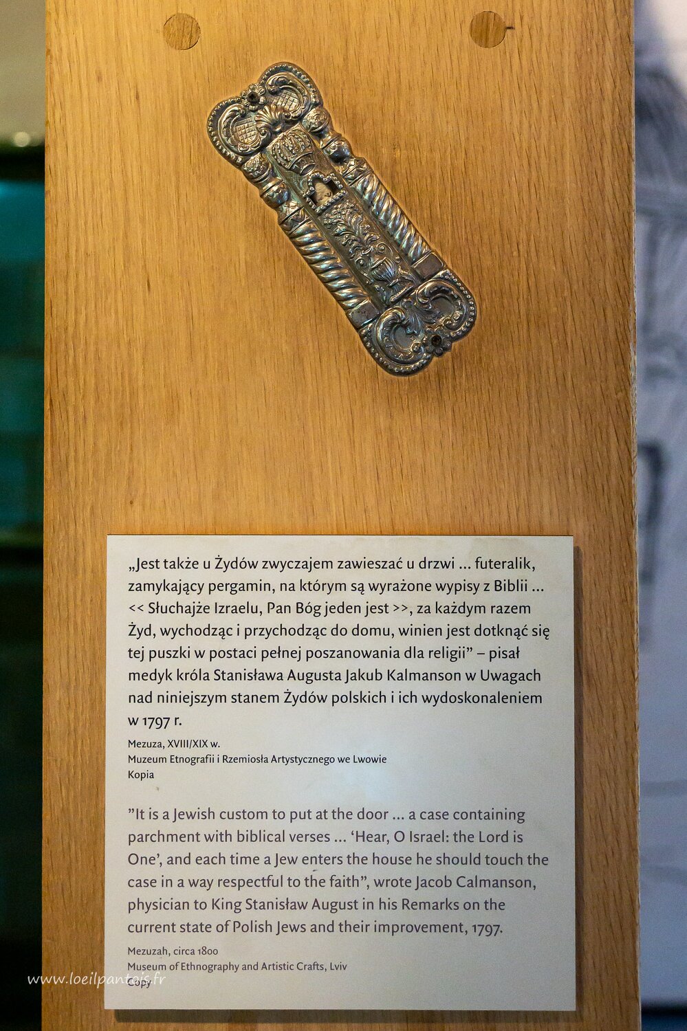 Musée de l'histoire des juifs polonais, Mezouzah, objet du culte juif, garni de quelques passages bibliques et rituellement fixé sur les chamblanles des portes
