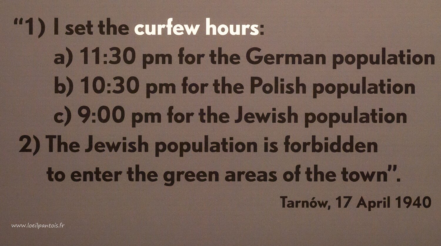 Musée de l'histoire des juifs polonais, proclamation allemande fixant les heures de couvre feu et instituant un début de ségrégation dans la ville de Tarnow