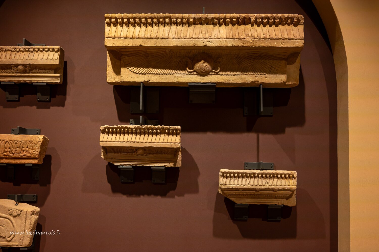 Musée national de Varsovie, fouilles de Faras, linteaux de portes et fenêtres avec un des frises de cobra, un disque solaire et des yeux de taureau, I, Ve s