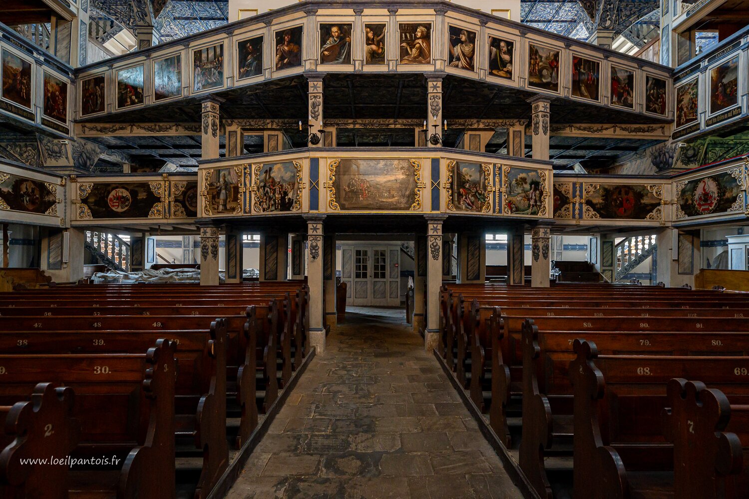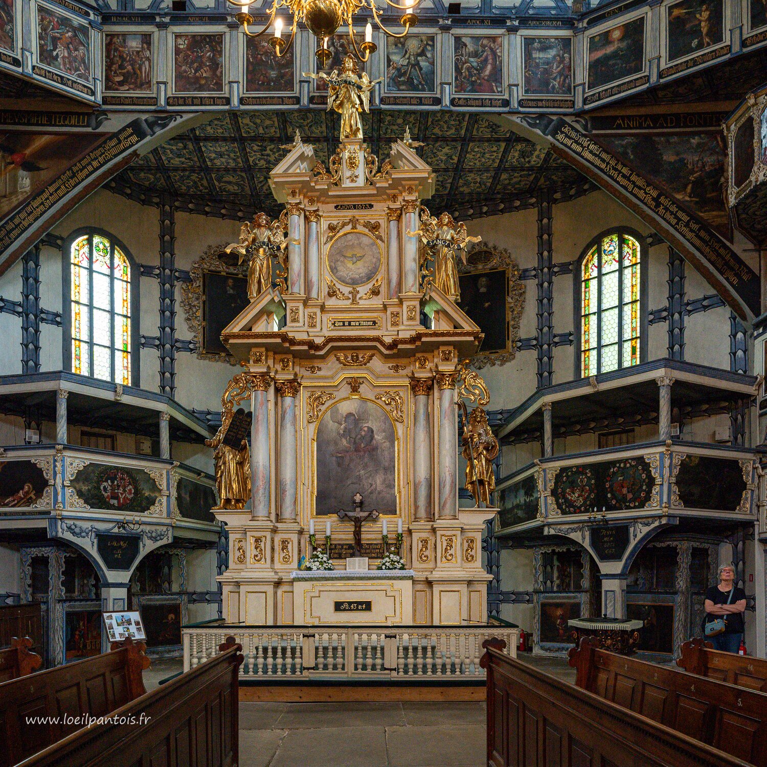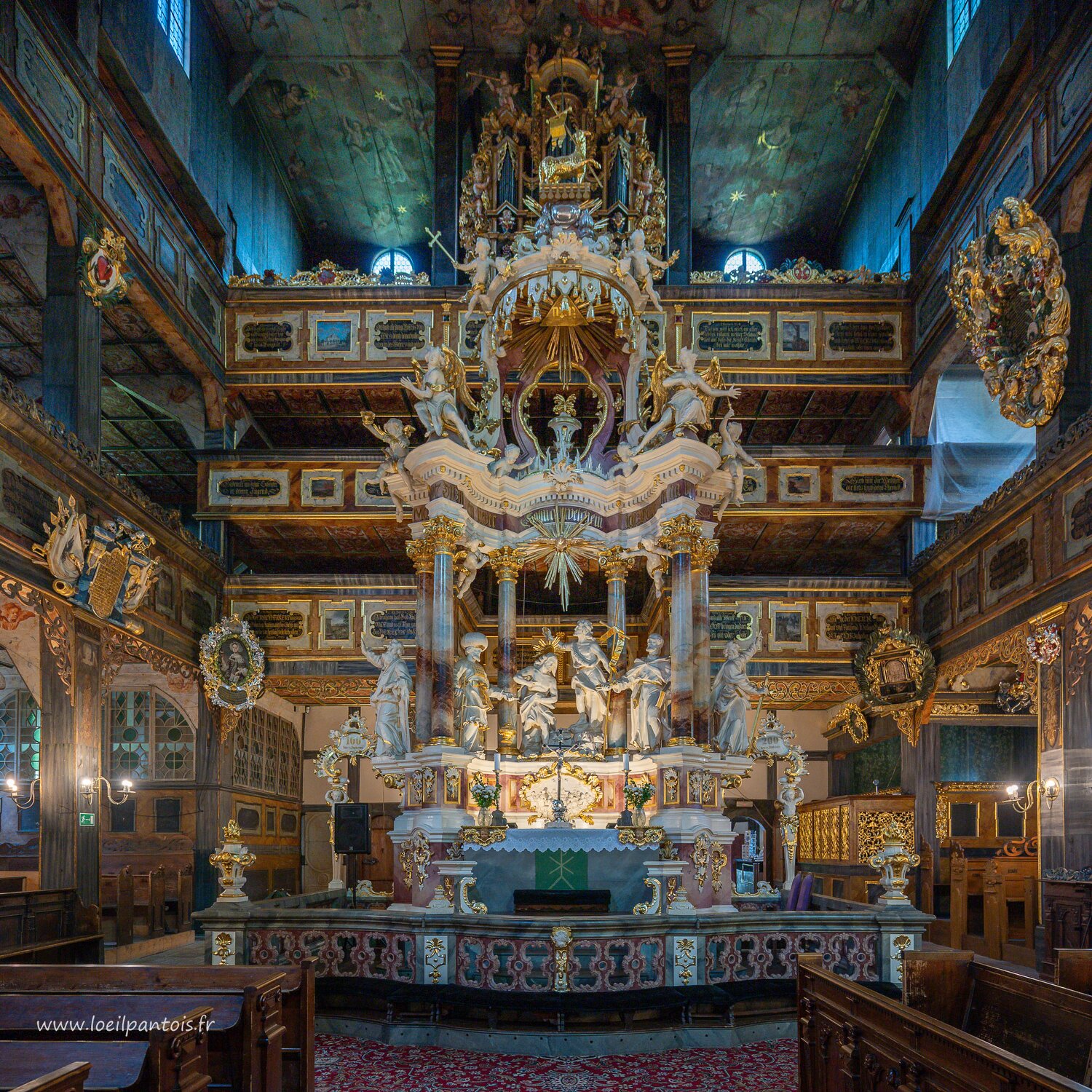 Eglise de Swidnica, l'autel commandé par un riche fidèle en 1752 à un charpentier. Les 6 statues représentent Moïse, Aaron, Jesus, Jean-Baptiste, et les apôtres…