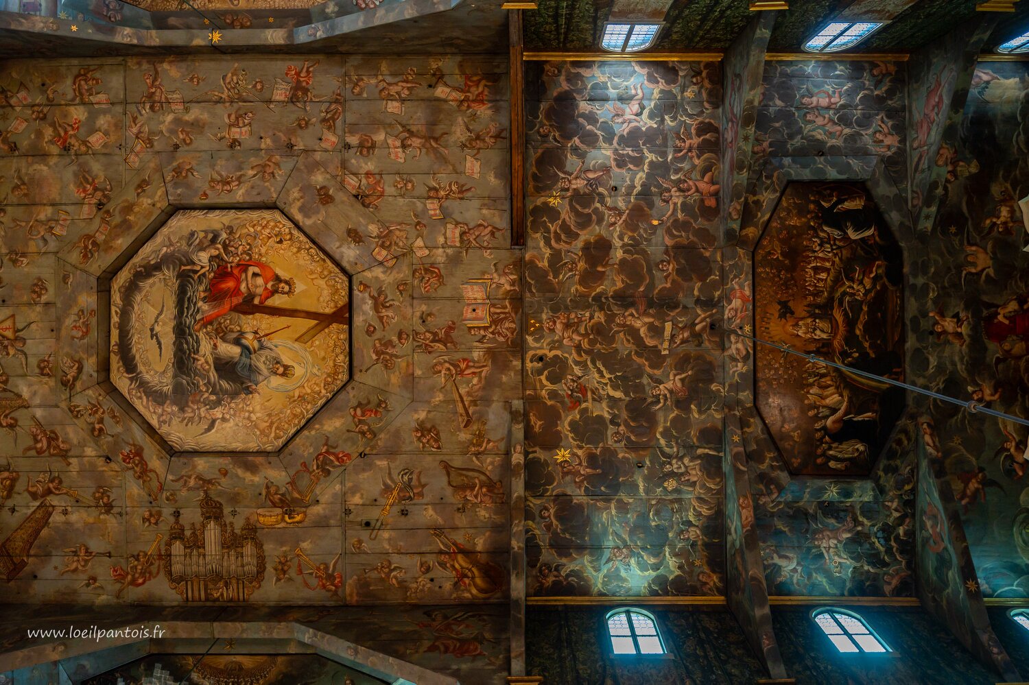 Eglise de Swidnica, détail peintures du plafond exécutées en 1696 par Chrystian Sussenbach et Chrystian Kolitschky, à gauche la Trinité, à droite Dieu le père,…