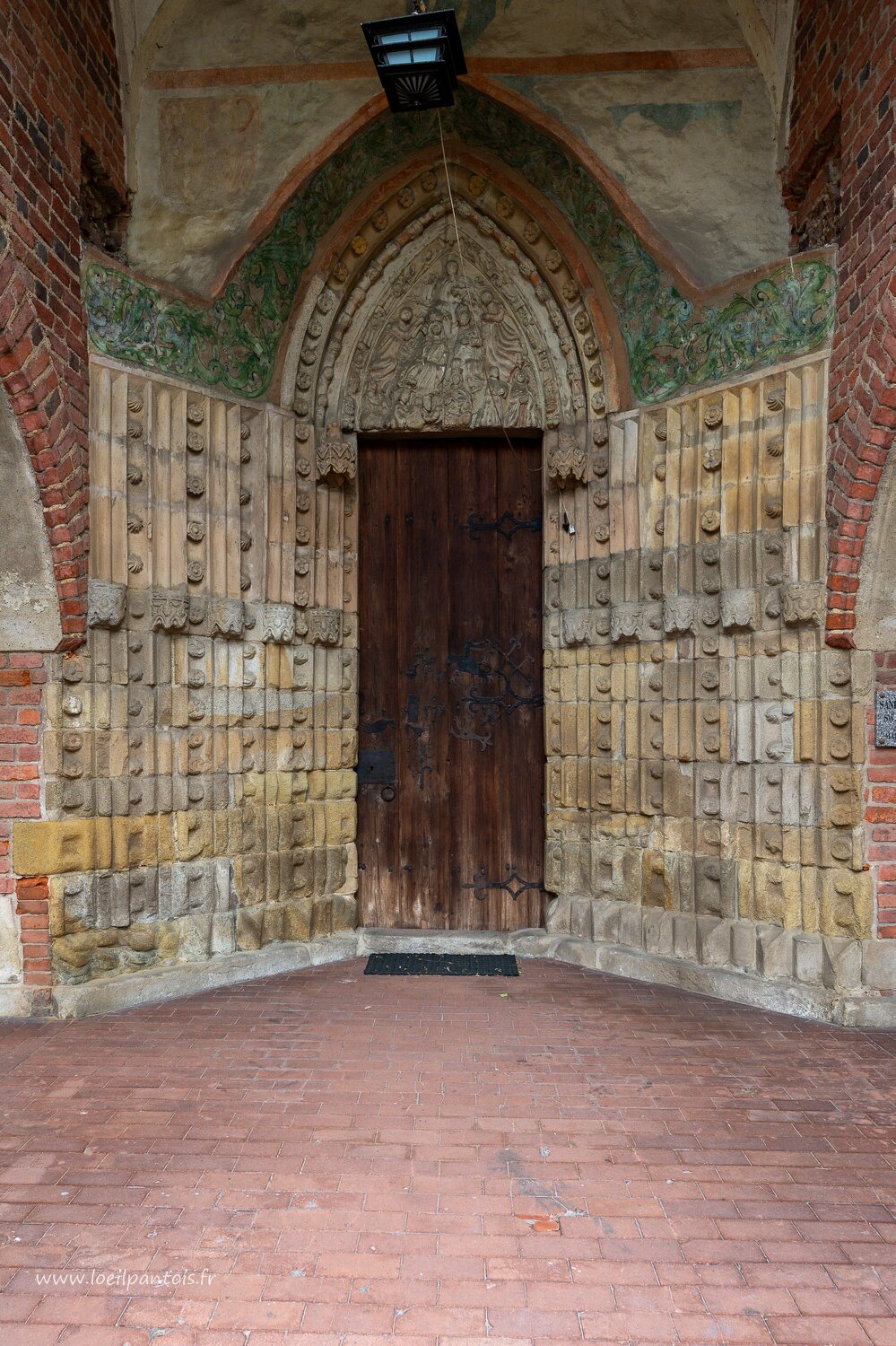 Malujowice, porche d'entrée de l'église Saint Jacques présentant de bas en haut, la Visitation, l'adoration des mages et le couronnement de Marie. IL est assez…