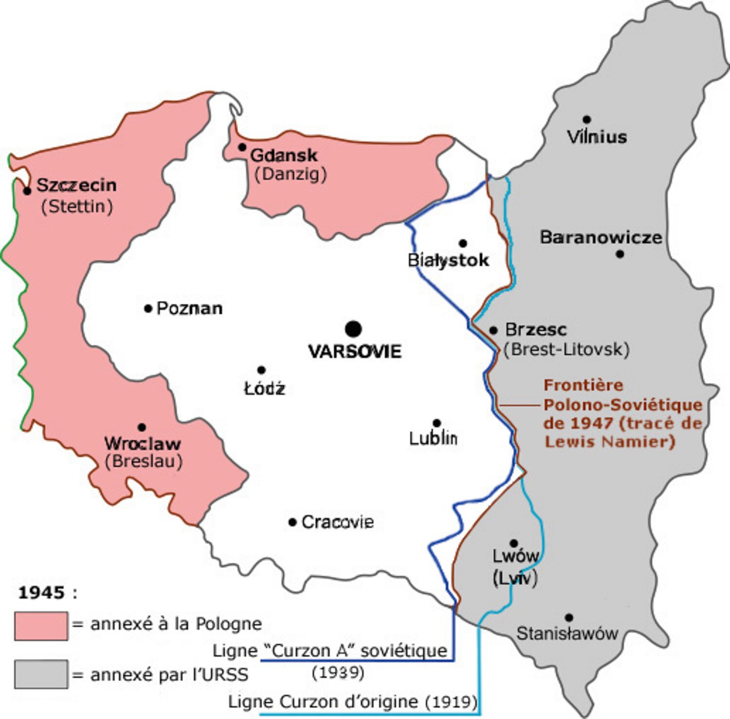 Carte simplifiée de l'évolution de la Pologne entre 1772 et 1945 (note: entre 1795 et 1918, la Pologne avait totalement disparu sauf un bref sursaut à l'époque…