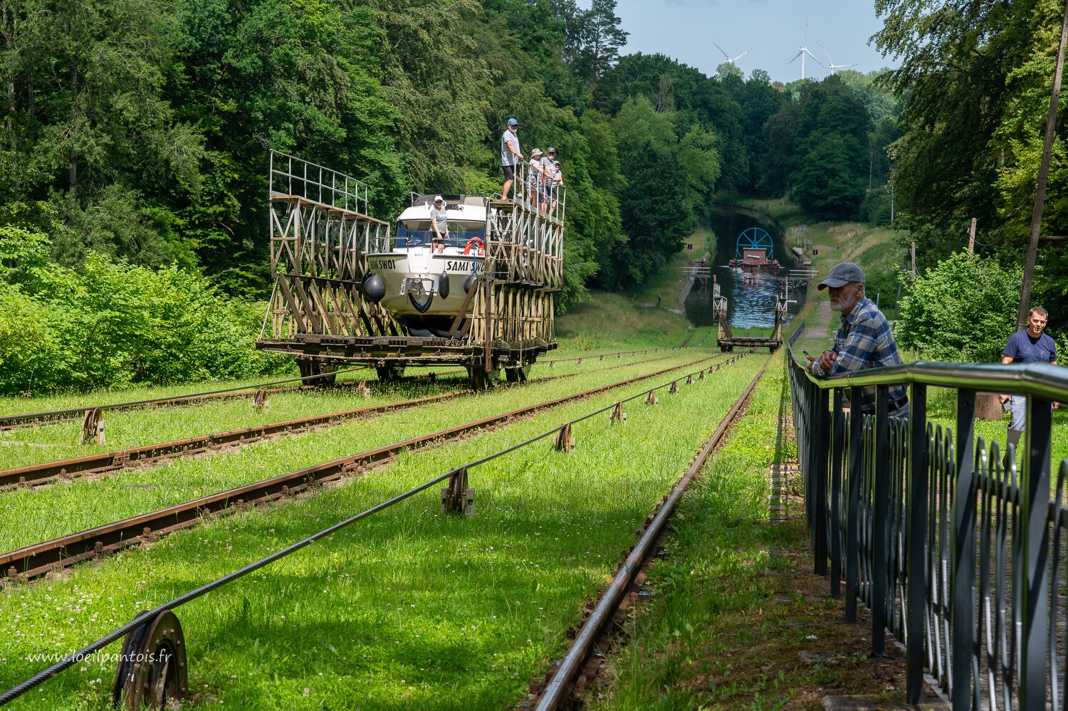 Canal d'Elblag, cale de Pochylnia Jelenie. Les deux chariots sont reliés au même câble, l'un remontant et l'autre descendant.