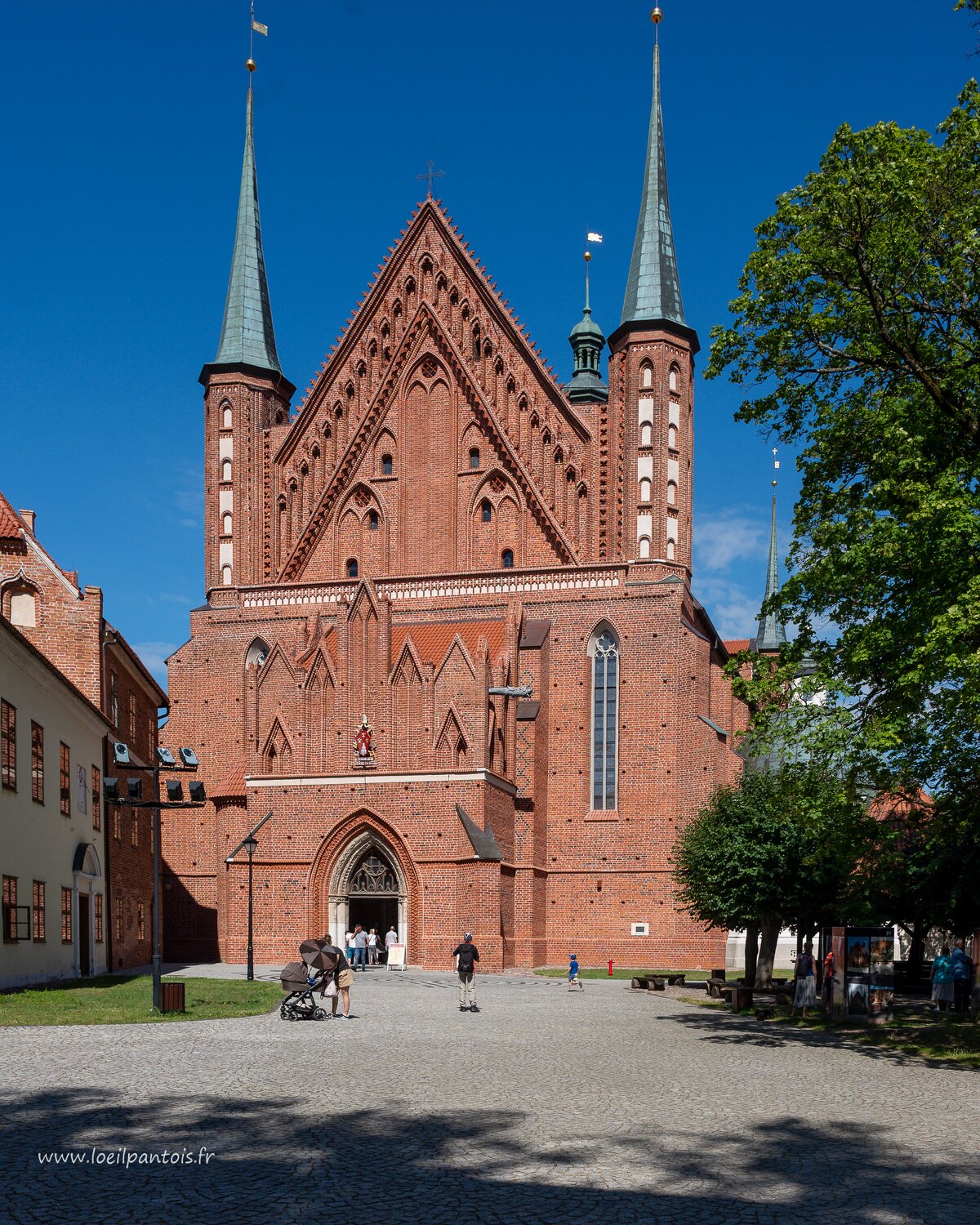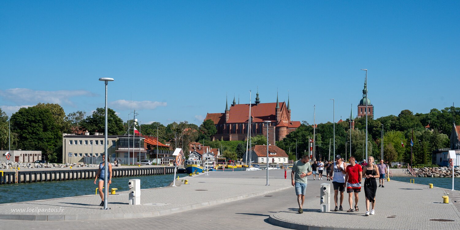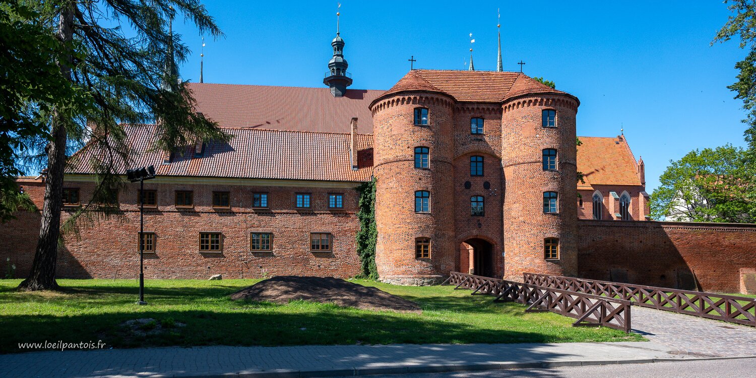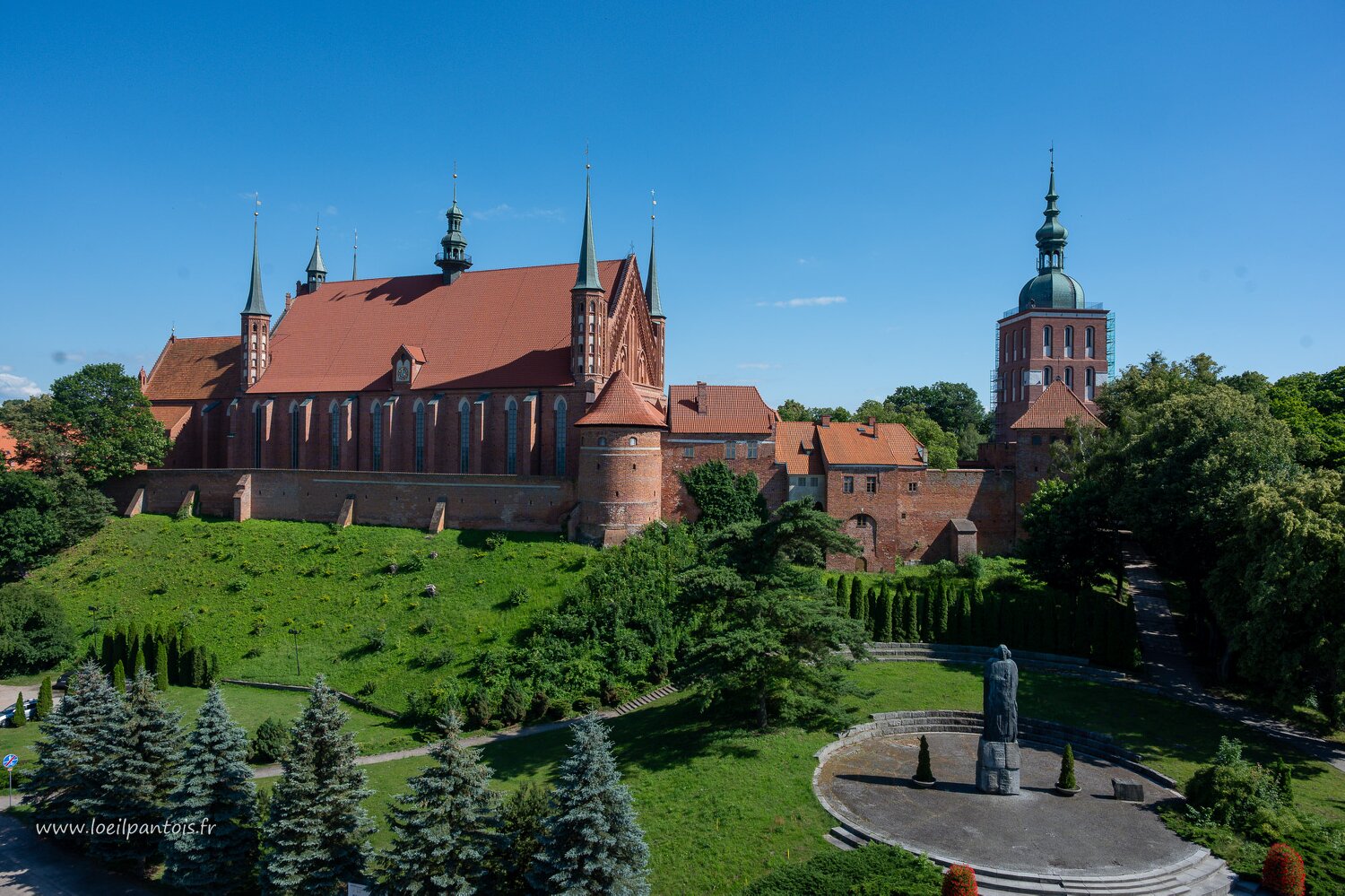 Vue d'ensemble de la cathédrale fortifiée de Frombork XIVe s, avec, au 1er plan, la statue de Nicolas Copernic qui en fut le chanoine à partir de 1497