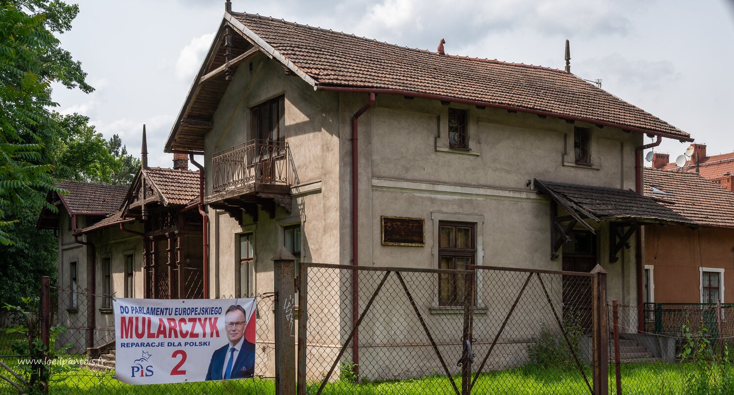 Nova Huta, maison antérieure à la construction du quartier avec une affiche électorale du PIS (droit et justice) parti conservateur et eurosceptique au pouvoir…