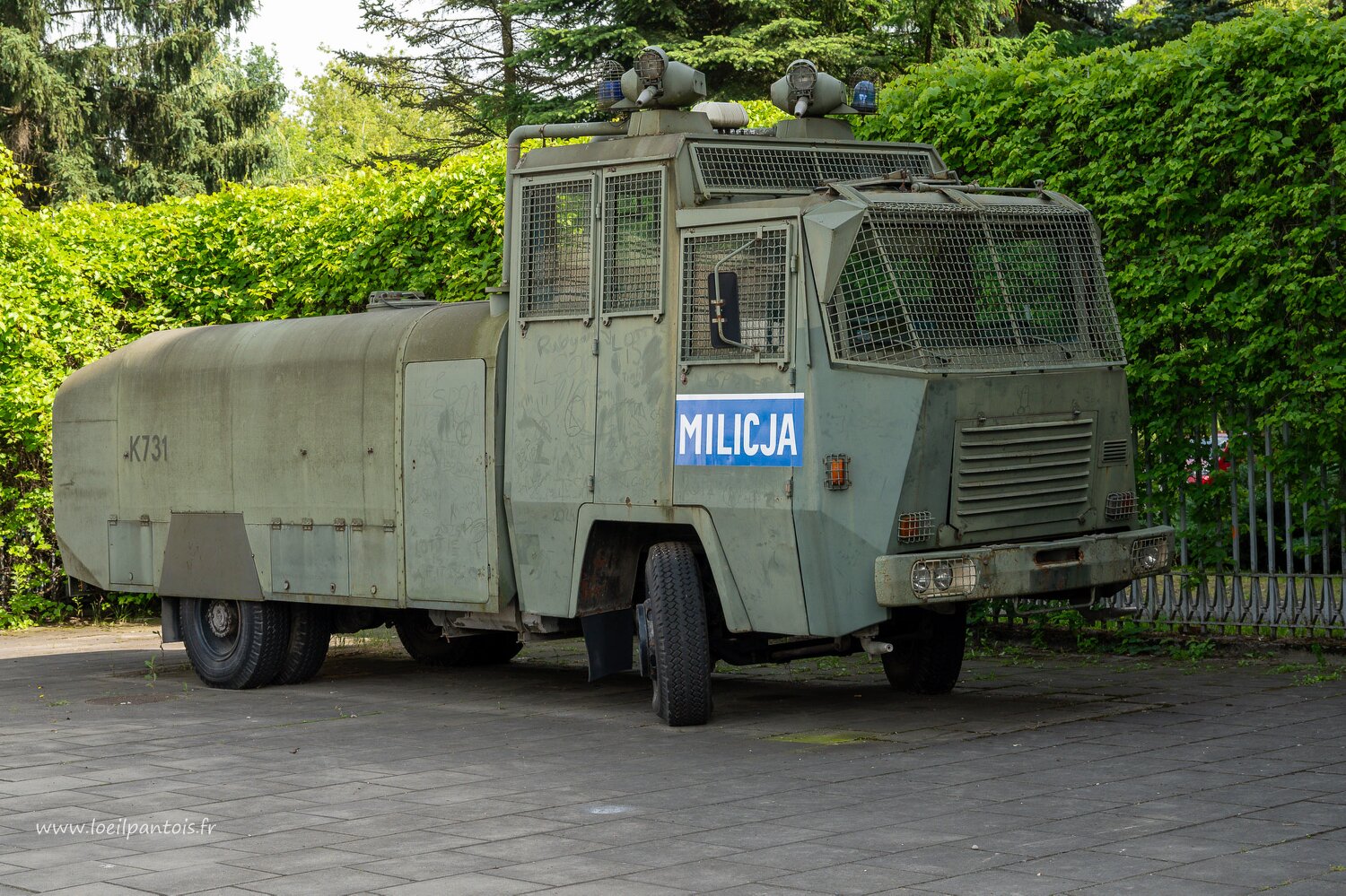 Nova Huta, camion anti émeute avec canons à eau utilisé dans les années 1980 contre les manifestations ouvrières. Le terme Milicja a été remplacé par policja en…