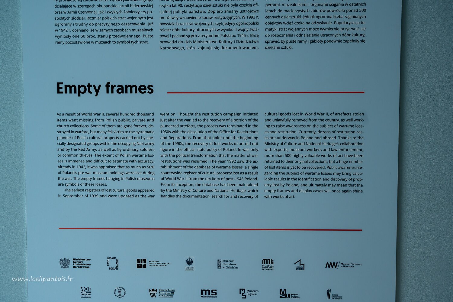 Musée des princes Czartoryski, dans les musées polonais, les "cadres vides" signalent les oeuvres disparues durant la 2e guerre mondiale, dont le texte dit…