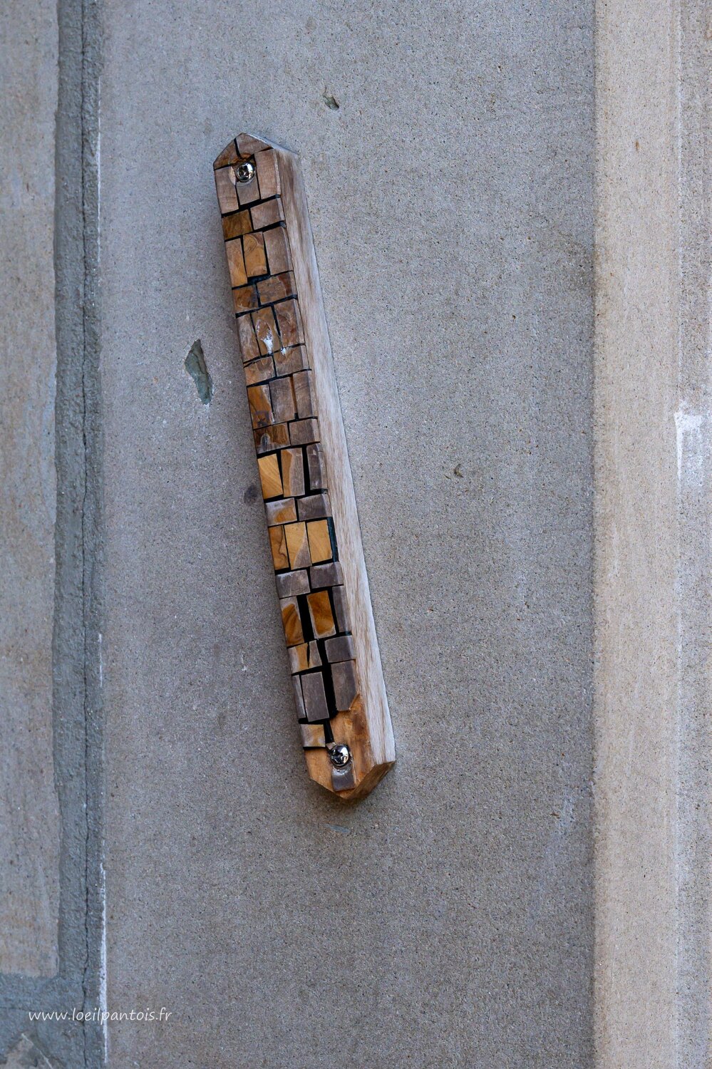Mezouzah, objet de culte, placé en biais sur le chambranle des portes d'entrée des maisons juives. L'inclinaison est un compromis entre la prescription de…