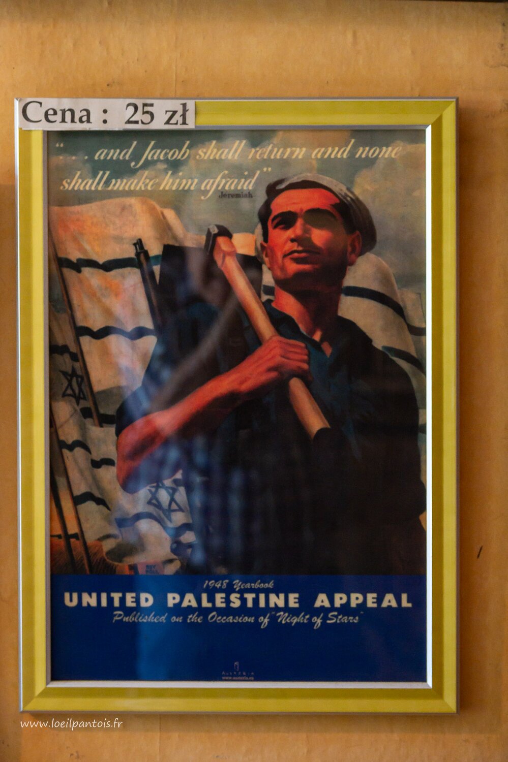 Rue Szeroka, dans la synagogue Remu, affiche de 1948 de l'UPA, la plus ancienne organisation humanitaire américaine palestinienne qui vise à donner aux…