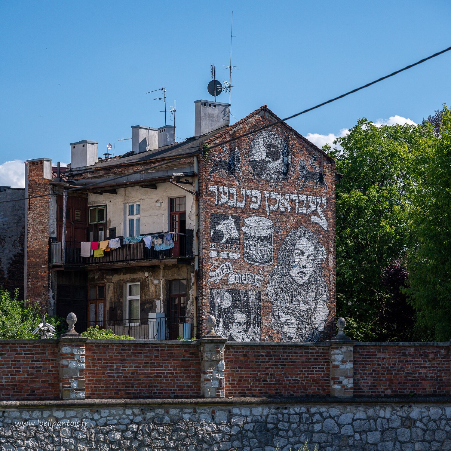 PIgnon de maison, près de la vieille synagogue. Peinture murale en noir et blanc sur le mur de l'immeuble dédiée aux trois filles de la famille Bosak, qui y…