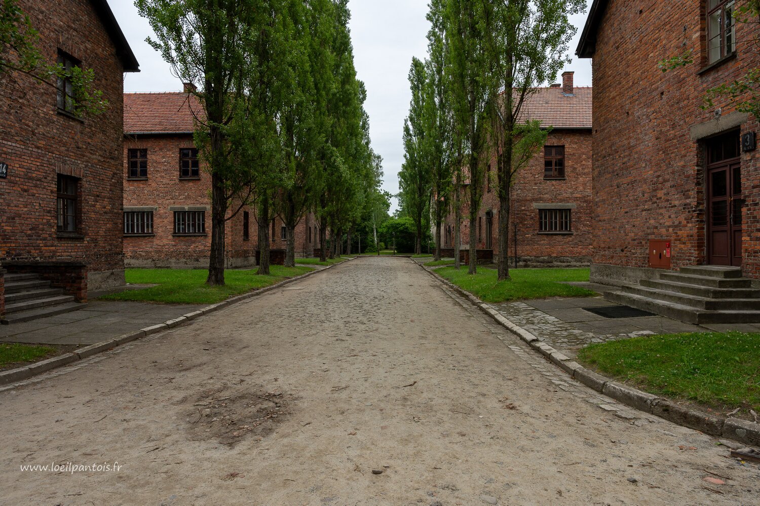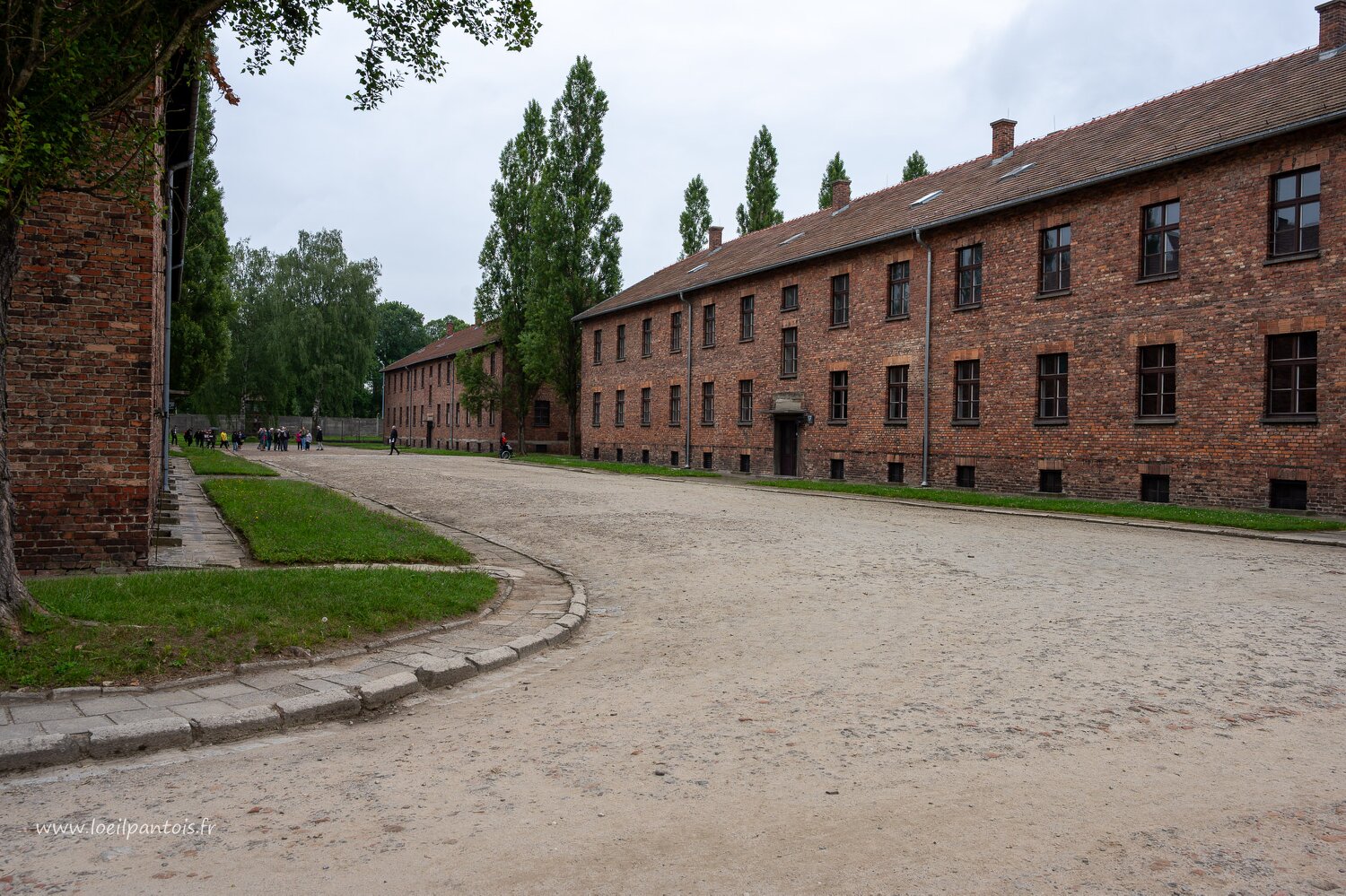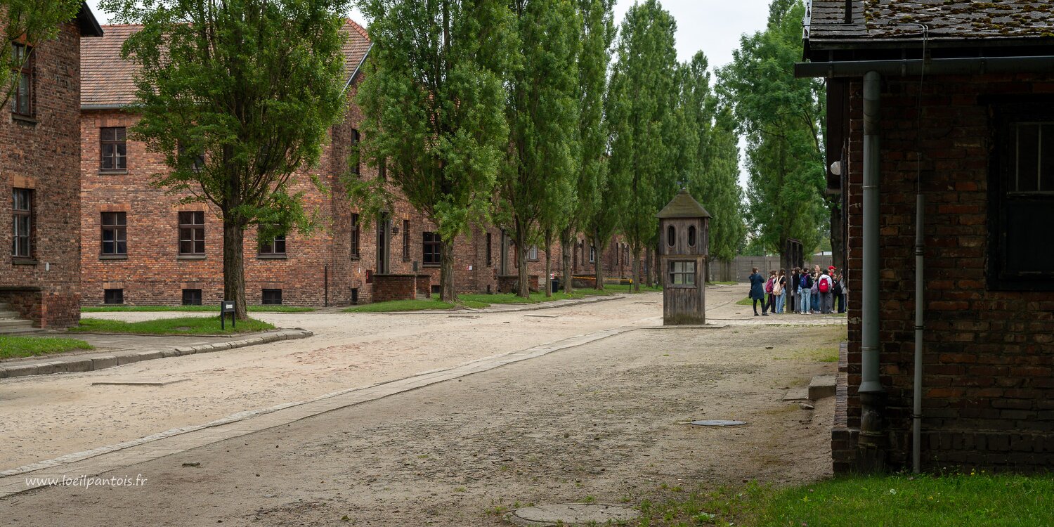 Mémorial d'Auschwitz-Birkenau, camp d'Auschwitz I, au milieu des 20 bâtiments d'origine (ancienne caserne réutilisée). La guérite est celle de l'officier…