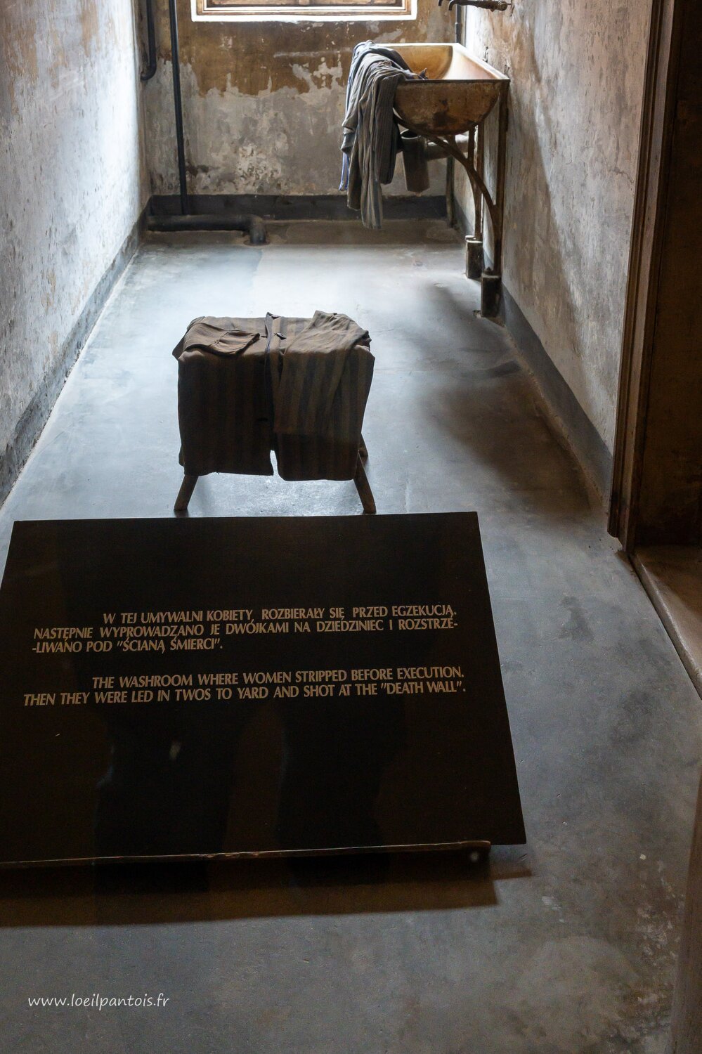 Mémorial d'Auschwitz-Birkenau, camp d'Auschwitz I, salle dans laquelle les femmes condamnées à mort se déshabillaient avant d'être conduites, par deux, au mur…