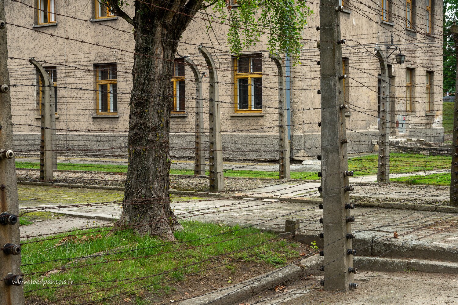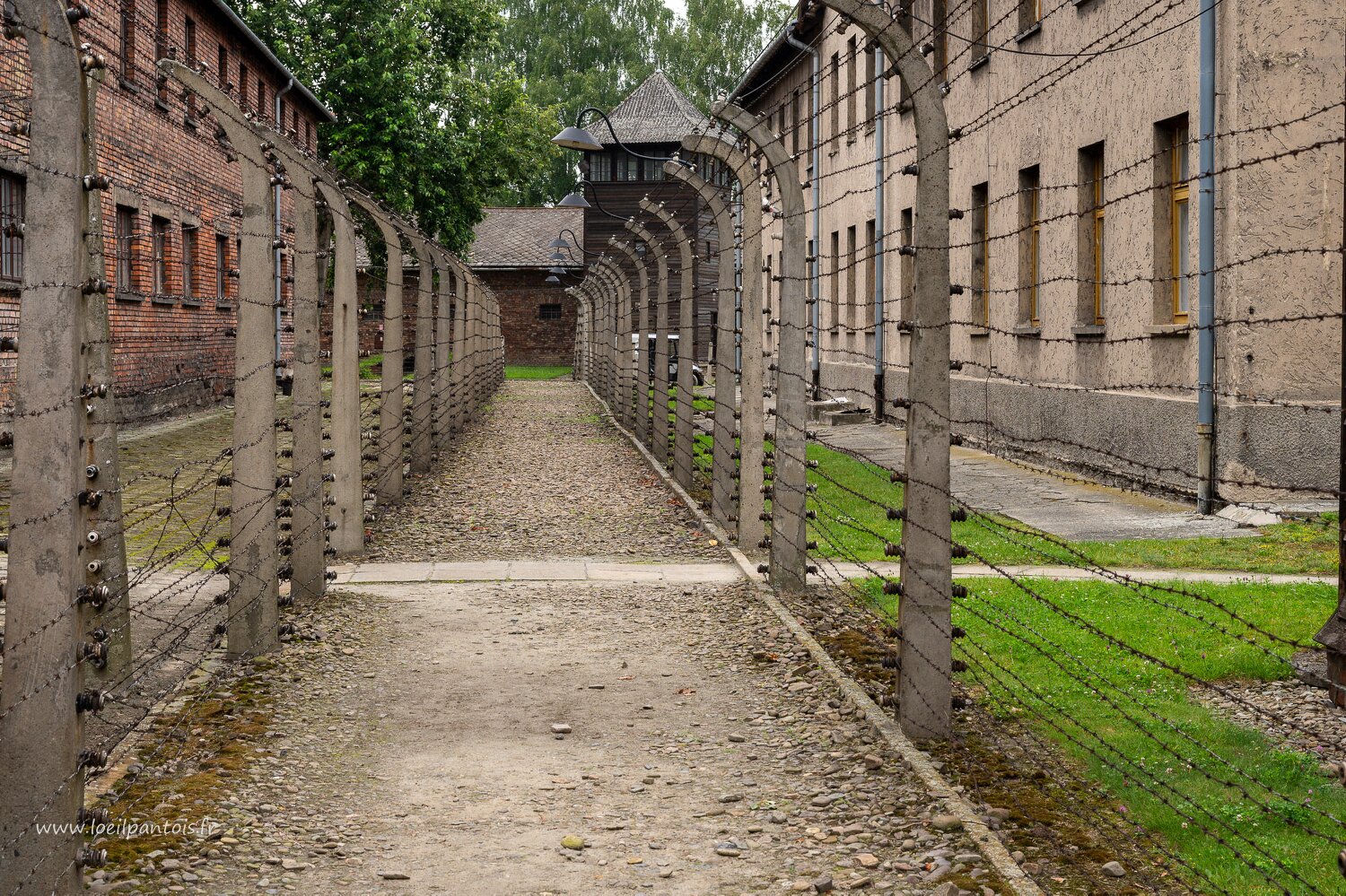 Mémorial d'Auschwitz-Birkenau, camp d'Auschwitz I, les barbelés sont innombrables à l'intérieur du camp pour séparer les différentes zones.